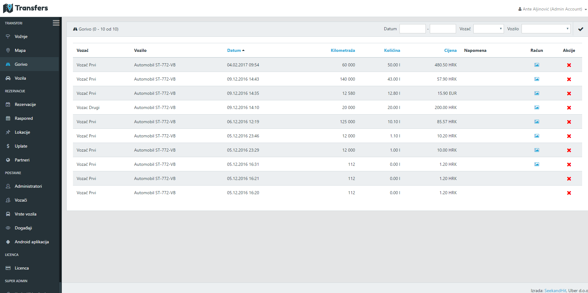 Evidencija svih troškova za pojedinog vozača/vozilo (gorivo, parking, autocesta itd.)