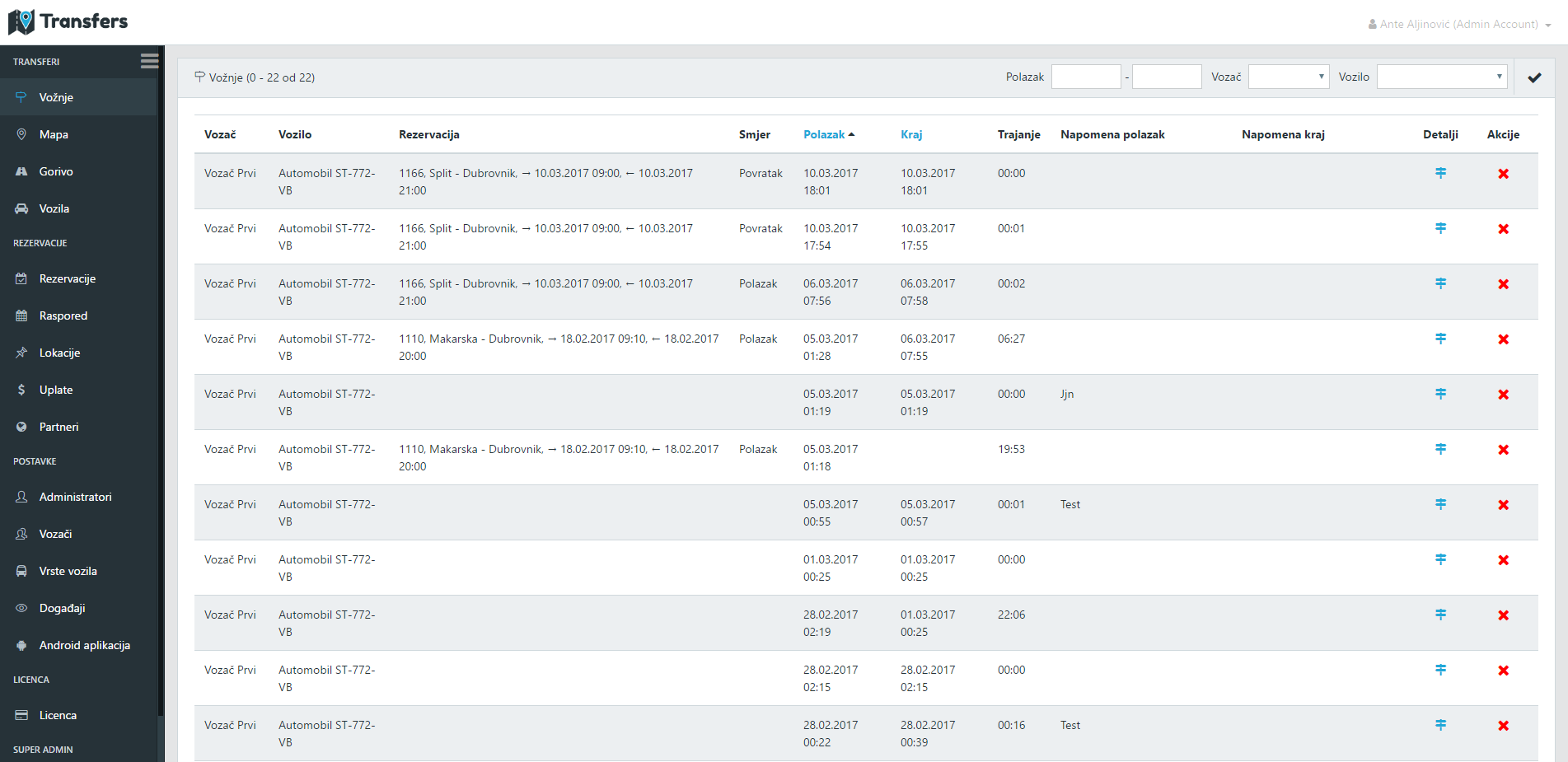 Preuzimanjem i završavanjem određene vožnje web sustav se ažurira sa novim informcijama (unos naplata, napomena vozača).